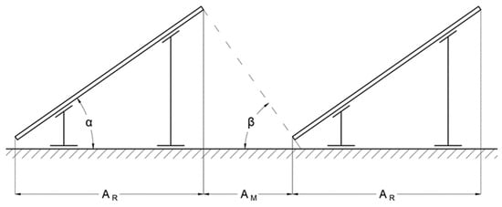 Rooftop arrangement of modules. Source: the authors’ own work. Symbols: α = angle of inclination of the panels; β = angle of incidence of solar rays; AR = length of module in base projection; and AM = length of incident shadow.