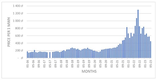 Distribution of energy prices in PLN/MWh on a monthly basis in the years 2016–2023. Source: the authors’ own work based on https://energy.instrat.pl/ (accessed on 21 June 2023).