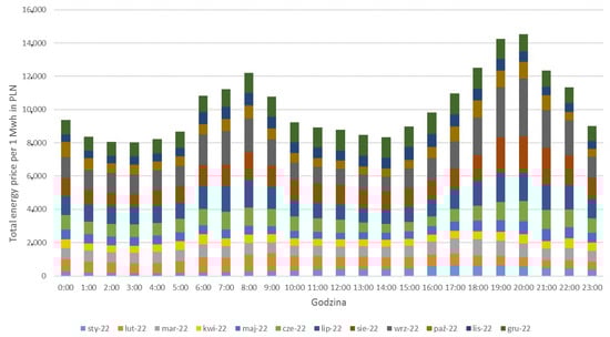 Distribution of energy prices in PLN/MWh by hour in 2022. Source: https://energy.instrat.pl/ (accessed on 3 July 2023).