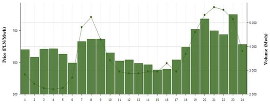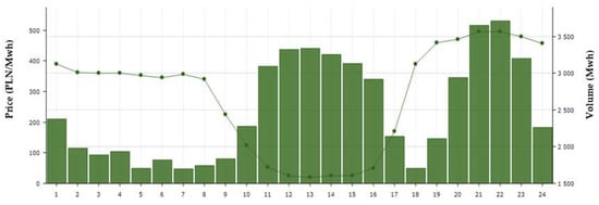 By examining the hourly price fluctuations on the Polish Power Exchange from the start of June 2023, it became evident that previous patterns are shifting. Hourly price volatility is increasing, indicating that energy storage is becoming economically viable. Based on data from the day-ahead market on the Polish Power Exchange, it can be seen that since the beginning of June 2023, the difference between the maximum and minimum prices per MWh is often doubled, and the gap widens with each passing day of the month []. Of course, during certain days, the price fluctuations are not as drastic (they do not increase linearly), but a price difference remains visible. Figure 8 and Figure 9 show significant price spikes in the evening hours (from 5 p.m.), while the period from 1 a.m. to 9 p.m. exhibits a relationship between price and volume of available energy. As volume decreases during these hours, the price increases, showing that energy supply and demand are interdependent.