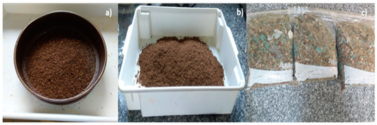 The preprocessed organic matter combined with paper served as the raw material for laboratory-scale thermal processing. The organic matter, post-crushing and sieving, was retained on a 12-mesh sieve (a), while the amalgamated organic matter, after sieving with a 4, 6, 12, and 14 mesh (b), and the organic matter plus paper, following the drying/crushing/sieving process and packed in plastic bags (c), were also prepared [28].