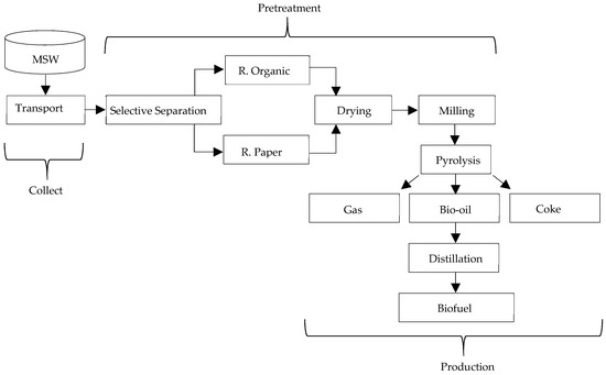 Therefore, for a better understanding of the project management process and the assessment of economic viability, a biofuel production flow through thermal processing of pretreated material (organic + paper) was created, as shown in Figure 2.