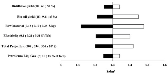 Figure 3 represents the sensitivity analysis conducted for a fraction volume of 2151.69 dm3/day. In order to attain the fuel minimum fuel selling price (MFSP) of USD 1.30/dm3, an assumed internal rate of return (IRR) of 10% is applied. It is concluded that the cost of material (organic matter + paper), bio-oil yield, total project investment and electricity, respectively, are the most significant variables that affect the MFSP.