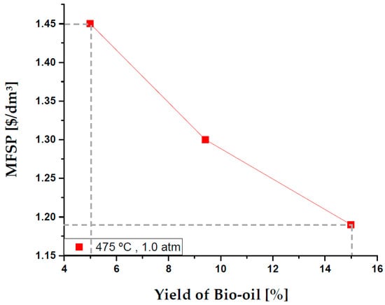 Figure 4 demonstrates that the increase in the yield of bio-oil in the pyrolysis results in a reduction of the MFSP. It is evident that percentages of 5% of bio-oil yield increase the MFSP to USD 1.45/dm3, while the improvement of the percentage of bio-oil yield to 15% reduces the MFSP to values below USD 1.19/dm3.