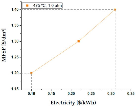 Minimum Fuel Selling Price relative to electricity through sensitivity analysis for production, taking into account a specific production volume of 2151.69 dm3/day.