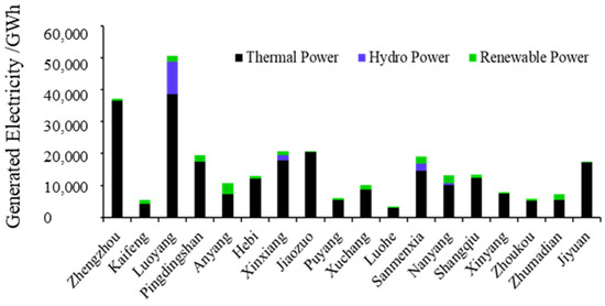 There is a positive correlation between the per capita electricity consumption and the level of social development. The per capita electricity consumption in Henan Province is only 74% of the national average. China is the largest developing country and is currently developing steadily. The rapid economic development will increase the demand for energy. In the future of Henan Province, with the development of the economy, there will be a substantial increase in electricity demand. It is expected that the electricity consumption in 2050 will reach about two times the current electricity consumption. In 2019, the overall power consumption in Henan Province was 336.4 billion kWh, and the power generation in the province was 281.57 billion kWh (coal-fired thermal power accounted for 86.72%) [26,27]. The external dependence of electric energy was 16%. The difference between local power generation and electricity consumption in various cities of Henan Province in 2019 is shown in Figure 1, and the shortfall is 54.8 billion kWh. The remaining required electricity is supplied from outside the province. The UHV line from Xinjiang to Hami is the main channel, and the annual supply of electricity is about 40 billion kWh/year. The composition of power and electricity in cities of Henan Province is shown in Figure 2. Thermal power accounts for a large proportion. China has determined that the number of thermal power units will not increase. In the future, the shortfall of electricity will be provided by wind and PV units. And the development potential of wind power and PV in Henan Province is high, laying a solid foundation for the realization of an energy revolution in Henan Province.