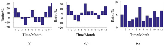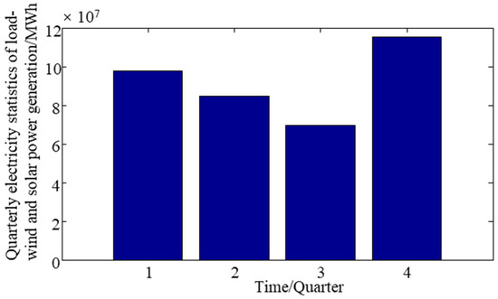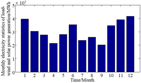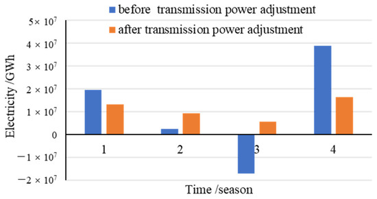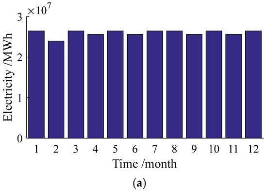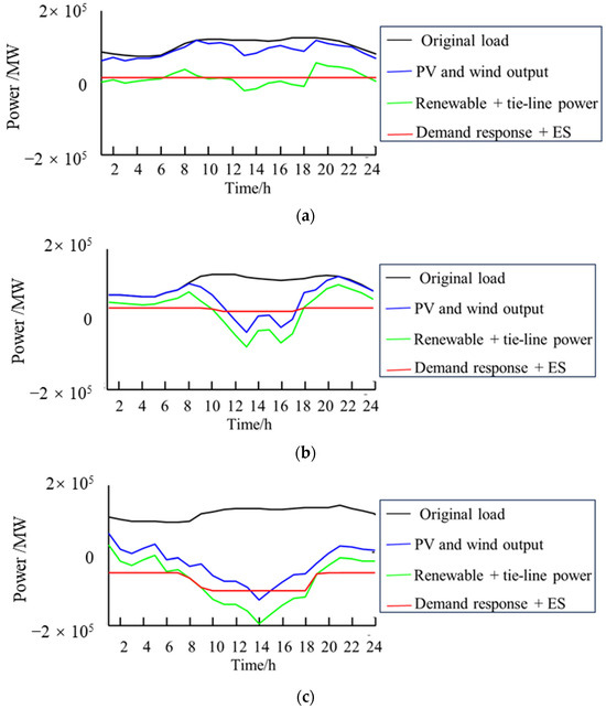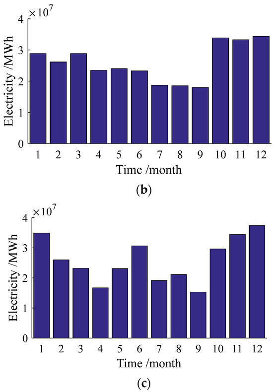 Assuming that in the electricity market environment, the power supply curve of the interprovincial liaison line can be adjusted on an annual, seasonal and monthly basis, the monthly transmission of electricity by the interprovincial liaison line is shown in Figure 15a–c. When the power demand of the connecting line is adjusted monthly, the demand for conventional units can be greatly reduced, the peak regulation demand of the power system can be reduced, and the power supply reliability of the power system will be greatly improved, as shown in Figure 16.