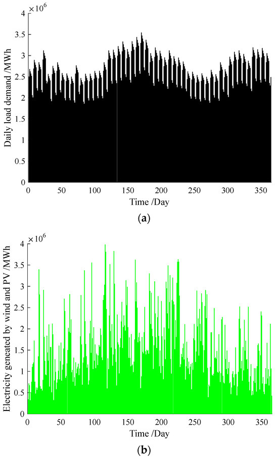 According to the scheduling priority, calls from outside the province should be continued at this time. It may be assumed that the electricity generated from outside the province is used in the electricity market environment, that is, that Henan Province buys more electricity on days with more a severe power shortage and less electricity on days with less power shortage, as indicated in Figure 6, so as to minimize the power balance pressure of the province. Therefore, how to reasonably arrange the 301.8 billion kWh of external electricity in Table 2 is very important for the power balance of Henan Province. At the same time, it should also be taken into account that in order to achieve the national dual carbon goal, the National Energy Administration estimates that “In 2050, China’s total installed power supply capacity will be 7.5 billion kW, of which 6.87 billion kW will be installed clean energy, accounting for 92%; The installed capacity of coal-fired power has been reduced to 300 million kW, the capacity of hydrogen-fired units has been reduced to 100 million kW, and the ES capacity has been reduced to 600 million kW”. This means that because the wind and PV power supply will play the role of the main power supply in the country, the peak regulation pressure throughout the country will be very large, even considering the power market environment. When the wind and light output in Henan Province is small, the sending system is likely to be short on wind and light, that is, Henan Province may not be able to buy electricity in the power market every day to fully meet the needs of the province.