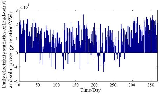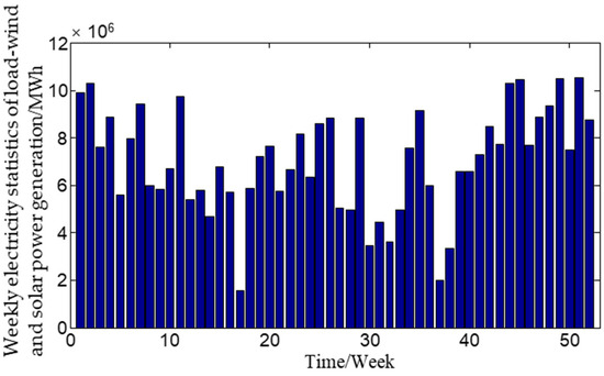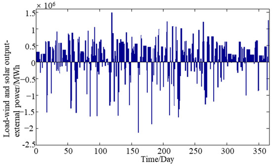 Taking into account factors such as the operational specifications of the interconnected power system, it may be considered that Henan Province will be able to purchase electricity on a weekly basis in 2050: the electricity market will be able to meet the electricity demand submitted by Henan Province every week, but the external power will remain at a relatively stable level during the week. Figure 10 shows the timing power of the external power in the first week of the simulation analysis (reflecting the basic requirement that the exchange power of interprovincial contact lines in the interprovincial power system specification must be maintained at a relatively stable level), Figure 11 shows the data on external electricity purchased per week in Henan Province for 52 weeks of a year (reflecting the mutual support between provincial and regional power grids through the power market), and Figure 12 shows the daily electricity statistics after considering external power generation. As shown in Figure 12, the external power load—wind and solar output—has significantly decreased the daily electricity data compared with Figure 10 (load—wind and solar output).