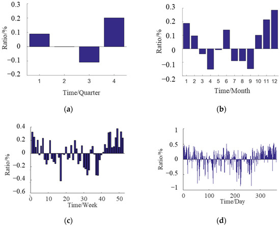 Proportion of power supply at different time scales. (a) Proportion of power supply shortage in different quarters. (b) Proportion of power supply shortage in different months. (c) Proportion of power supply deficits in different weeks. (d) Proportion of power supply deficits on different days.