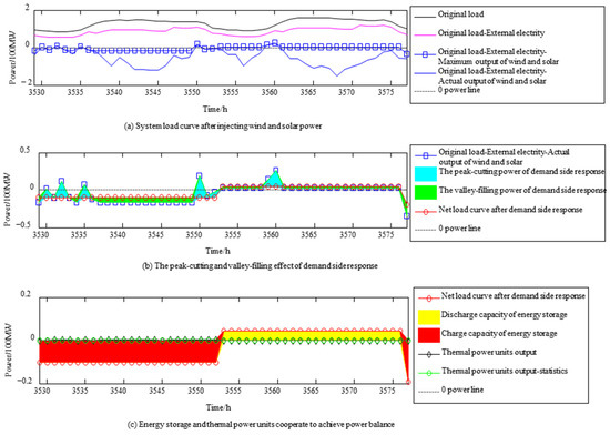 According to Figure 14, because the installed capacity of wind and solar units in the system is greater than the maximum load of the system, the load of the system may become negative, and the flexible resources of rechargeable and dischargeable types such as demand-side response and ES must be invoked; in order to meet the power balance of the system, it is likely that 100% of the wind and solar power generation will not be consumed, and the wind power or PV power generation in certain periods must be discarded.
