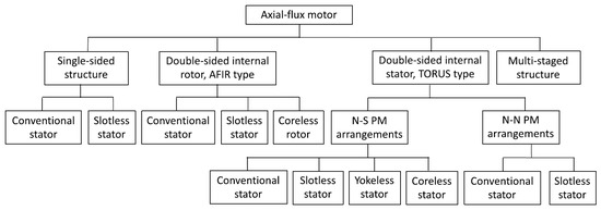 The AFPM motor is a strong candidate due to its high torque density in comparison to conventional radial-flux permanent magnet (RFPM) motors [3,4,5,6]. AFPM motor topologies are mainly classified as shown in Figure 2 [7]. A lightweight design is important to save fuel and extend flight times in the aviation industry [8,9]. Direct-drive propulsion without a mechanical-reduction gear system was selected in this work. For this reason, a high-torque-density AFPM motor topology was considered.