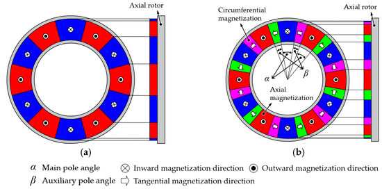 The design of the PM arrangement on the rotor can enhance the output performance of a motor. Compared to the SPM array type, as shown in Figure 4a, the HPM array type (Figure 4b) exhibited a significantly increased back-electromagnetic force (EMF), resulting in an improved output torque [18,19]. Previous research has shown that the torques of coreless HPM-array-type rotor AFPM motors are increased by 43% and 50%, respectively, compared to SPM-array-type rotor AFPM motors [18,19]. One study examined an axial–radial PM Halbach-array-type AFPM motor [6], which had a high torque compared to Halbach-array-type AFPM and RFPM motors, while another indicated that the HPM array type had a 28% higher torque than that of the spoke array type [20]. Other studies [21,22] have found that the torque performance can be further improved by adjusting the main and auxiliary pole angles of the HPM array type, as shown in Figure 4b.