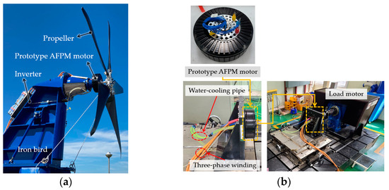The experiment to verify the prototype AFPM motor was conducted through iron bird and dynamo tests, together, as shown in Figure 6. The iron bird test, as shown in Figure 6a, refers to a ground-based test for a prototype UAM system with the propeller load. Water cooling was applied during the experiments, taking into account practical application situations. To obtain the required performance results at both the rated and peak output powers, a motor dynamo test was conducted using the motor dynamo test setup, as shown in Figure 6b, and the measured results are listed in Table 2.