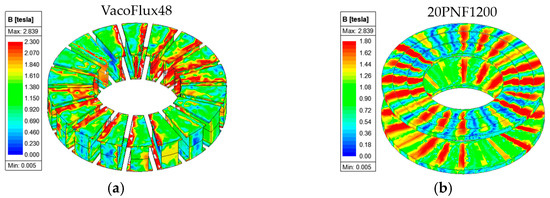 The appropriate selection of core materials is one of the methods for improving the performance of a motor. The iron–cobalt alloy core VacoFlux48, which is a non-oriented electrical steel, applied to the prototype AFPM motor, as shown in Figure 5 and Figure 6, was selected for the stator core to achieve a high torque density. However, this iron–cobalt alloy core is expensive compared to other core materials, such as grain-oriented electrical steel or an iron–silicon-alloy-type core of non-oriented electrical steel. To alternate the iron–cobalt alloy core for the stator and core, the electromagnetic performances using grain-oriented electrical steel and soft magnetic composite (SMC) materials were investigated in this work.