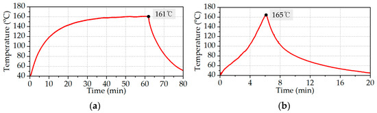 Ensuring thermal stability in the winding PMs is important due to their limited temperature range (winding = 220 °C and PM = 180 °C). To address this, the temperature rise on the winding was measured during the continuous operation at both the rated and peak output powers. Figure 9 shows the temperature rises on the winding. In the case of continuous operation at the rated output power, a maximum temperature of the winding of 161 °C was measured after one hour of operation. Compared to the temperature rise of the rated output power, as shown in Figure 9a, the temperature of the peak output power as shown in Figure 9b increased dramatically due to the high current density. The temperature of the PMs was measured after halting the continuous operation due to the PMs being rotated during operation, which means that a thermocouple sensor could not be attached. The measured temperatures of the PM of the rated and peak output powers were 100 °C and 120 °C, respectively.
