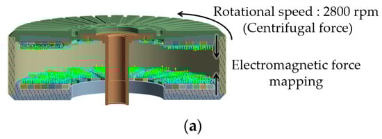 Although the maximum rotational speed of the proposed AFPM motor was 1800 rpm, a rotational speed of 2800 rpm was considered, taking the worst outcome into account. The electromagnetic force, calculated using an electromagnetic analysis, was mapped on the surface of the PM, as shown in Figure 10a. Figure 10b shows the deformations from magnetic and centrifugal forces. The deformation generated from the electromagnetic force was much larger than that of the centrifugal force. By adding magnetic and centrifugal forces, a total deformation of 0.271 mm was generated. Therefore, the prototype AFPM motor had an uneven air-gap length. A maximum stress of 67.18 MPa occurred on the PM.
