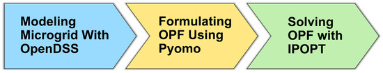 The overall OPF modeling framework is as illustrated in Figure 1. The initial modeling step involves using OpenDSS to model the microgrid circuits. During this phase, various electrical components such as lines, transformers, loads, PVs, and BESSs are integrated into the model. Once the microgrid model is established, a basic power flow analysis can be performed to assess a snapshot overview of the microgrid’s operational condition. Subsequently, in the second modeling step, relevant circuit parameters, such as the system admittance matrix and specific details of each electrical component, can be extracted from the OpenDSS model to formulate an OPF problem. In this step, controls or specifications for the electrical components and the system operation requirement constraints that are not reflected in the OpenDSS model can also be incorporated. Finally, Pyomo interfaces with the IPOPT solver to effectively solve the formulated OPF.