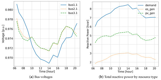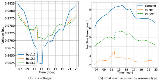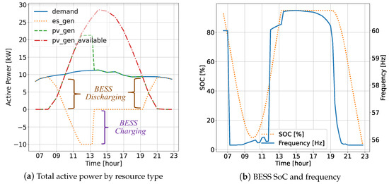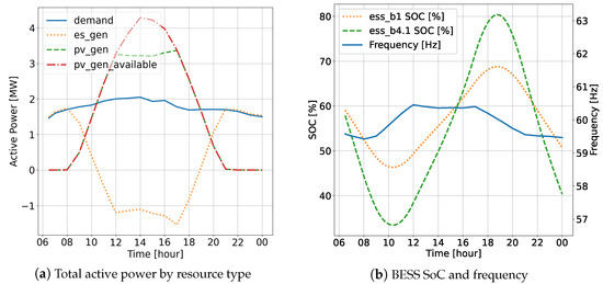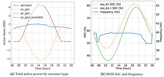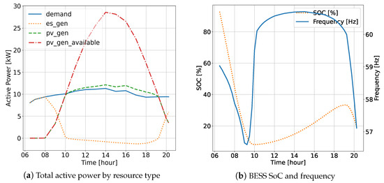Figure 3 and Figure 4 present the QSTS simulation results of the PF analysis, including profiles of the power, system voltages, frequency, and BESS SoC level. Figure 3b shows the progression of the BESS SoC level and system frequency over time. It can be observed that the microgrid could maintain islanded operation until 8:15 p.m. before the microgrid frequency dropped below the operating limit. In Figure 3a, the total active power profile, categorized by resource type throughout the analysis period, is illustrated. The total demand (demand) consistently remained around 10 kW throughout the day. The BESS generation profile (es_gen) shows that the BESS achieved a maximum charging rate of less than 5 kW during the afternoon. Additionally, it can also be observed that the active power output of the PVs (pv_gen) was curtailed from their available generation (pv_gen_available). In Figure 4a, the system voltages are shown to be within the operating requirement during the entire islanded operation. Additionally, in Figure 4b, the effectiveness of droop control in coordinating the PVs and BESS to supply reactive power to the loads is illustrated.