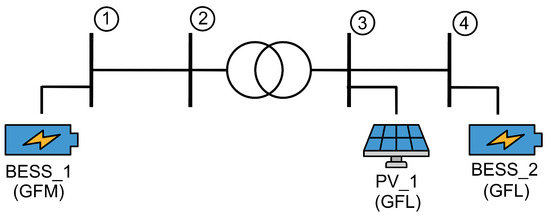The demonstration islanded microgrid circuit was as illustrated below in Figure 2. The system was a simple single-phase three-bus 240 V system where the nominal frequency was 60 Hz. Two circuit variations were considered. In the first circuit variation (Microgrid I), there was a GFM BESS at Bus 1 and a PV GFL (PV1) at Bus 3. There were three identical loads at each bus. In the second variation (Microgrid II), there was an additional PV (PV2) at Bus 2 also operating as a GFL. and for all IBRs were set to 240 V and 60 Hz, respectively. The admittance and were S and S, respectively. The current limit of all PDEs was 100 A. The lower and upper limit of the SoC were 0% and 100%, respectively. The details of the IBRs and loads are summarized in Table 4.