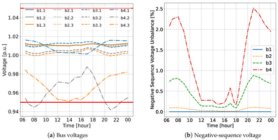 The OPF simulation results are shown in Figure 10 and Figure 11. Figure 10a shows that PV generation was fully utilized with the optimal dispatches. All of the additional energy during peak PV generation was being used to charge both BESS_1 and BESS_2. Figure 10b illustrates that the islanded microgrid operated with its frequency within the specified operating range. Additionally, in contrast to the results obtained from the PF of the microgrid, the SoC of BESS_1 was regulated closer to the target of 90% compared with BESS_2. This highlights the effectiveness of assigning a higher penalty cost for SoC mismatches in the objective, emphasizing the priority given to regulating BESS_1. As depicted in Figure 11a, the voltages of all buses were maintained within the specified operating ranges. There were no instances of undervoltage when compared with the results for the PF solution. Figure 11b displays the resulting negative sequence voltage imbalance of the microgrid. It can be observed that the active and reactive power dispatches determined by the OPF generally contributed to reducing the overall voltage imbalance, except during the early morning.