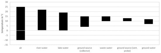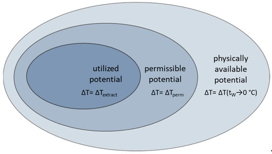 The choice of temperature reduction is decisive for the type of heat potential. In principle, the physically available, the permissible, and the utilized heat potential can be differentiated (see Figure 1). A body can be cooled down to absolute zero. From the physical point of view, cooling to the freezing point is interesting, as this is heat extraction from a body of water with a liquid medium (physically available heat potential). As cooling to freezing point carries the risk of damage to the system due to ice formation and as the temperature difference should be limited for ecological reasons, the permissible potential (see Section 3.1.3 and Section 3.10) reflects the heat extraction that is legally and technically feasible. Heat extraction systems do not fully utilize the permissible potential, as the heat extraction rate of the systems are not sufficient, and not all of the heat potential is required. The amount of heat actually extracted is the utilized potential.