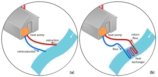 There are basically two heat extraction systems (see Figure 2): the open system and the closed system [3]. The open system extracts water from the river, passes it through the heat pump’s evaporator, and then returns it. This system has low energy losses but is only suitable for bodies of water with high water quality and a low risk of ice formation. The closed system separates the evaporator from the river and uses a heat exchanger with a heat transfer circuit to absorb the heat and transport it to the heat pump. Due to the system separation, this system has higher energy losses (approx. 1 K heat loss [2]) but is more resistant to contamination and ice formation.