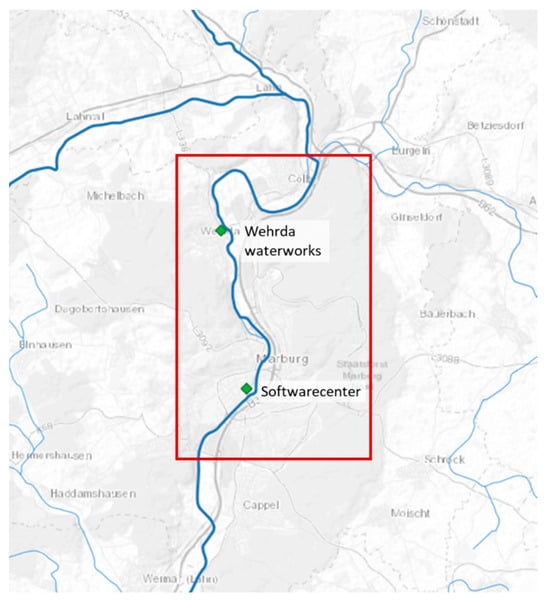 Site 1. “Wehrda waterworks” (see Figure 4): The Wehrda waterworks of Stadtwerke Marburg GmbH are located in Wehrda. As part of the construction of the new waterworks, transport pipelines for the extraction of river water heat can be considered. Upstream of the waterworks is the Wehrda weir, which dams up the Lahn river, originally to generate electricity from a hydroelectric power plant. The turbine has been shut down and the associated siphon system is no longer active. This means that there is practically no current in the millrace.