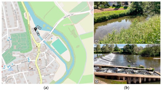 (a) Cartographic illustration of the Lahn river below the Wehrda weir; (b) photographic representation of the Lahn river in the canal (top) and in the mother bed (bottom); m: operational area in millrace; r: operational area in river, main channel; A: connection point.