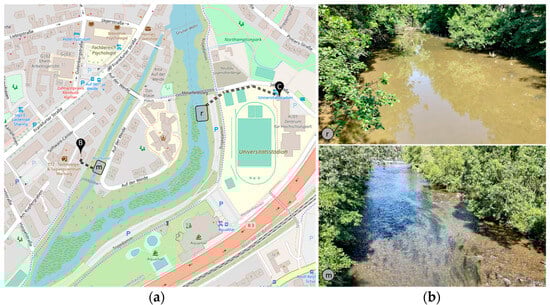 (a) Cartographic illustration of the Lahn river below the Grüner weir; (b) photographic representation of the Lahn river in the canal (top) and in the mother bed (bottom); m: operational area in millrace; r: operational area in river, main channel; B, C: connection points.