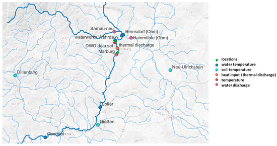 A British study produced a heat map (surface waters), not on the basis of daily averages but of three-month averages from December to February [7]. Although this may be adequate for comprehensive studies, it does not consider any underrun days (see Section 3.1.4), which can be decisive in assessing the usability of river heat. Furthermore, the water temperatures were interpolated along the watercourse and further calculated with the interpolated temperature values at the gauge for discharges. For Marburg, it was assumed that the spatial temperature changes within Marburg were not significant and were therefore considered constant (see Figure 10 and Table 3).