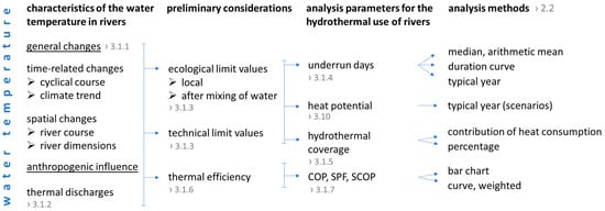 The evaluation of water temperature for the use of river heat is complex and takes place at different levels. Figure 7 shows the levels and in which subchapter the aspects are dealt with (generally from left to right).