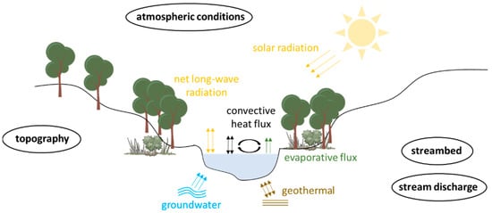 Characteristic changes in water temperature can be seen both temporally and spatially, the cause of which lies in the thermal balance of rivers (see Figure 8). Topography, atmospheric conditions, streambed, and stream discharge as influencing groups affect the heat exchange processes involved and thus influence the thermal regime of rivers [18]. Figure 9 shows the resulting temporal and spatial variability of the water temperature.