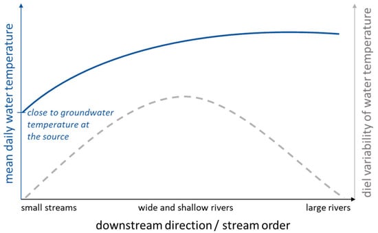 Near the river source, the water temperatures roughly correspond to the groundwater temperature. The average daily water temperatures rise in the direction of flow, although this increase varies depending on the river (see Figure 9). For smaller streams, it is about 0.6 K/km, while for larger rivers, the increase is slower, about 0.1 K/km. In addition, the temperature varies depending on the shape of the river [18]. In terms of time, a distinction can be made between the annual and daily cycle. Within a day, the water temperature reaches its minimum in the early morning, rises until late afternoon, and then falls again (see Figure 9). Daily temperature fluctuations vary depending on the river shape. The annual cycle shows a sinusoidal course; in the moderately cool climate zone, the daily mean temperature rises from spring to its peak and falls again from early fall.