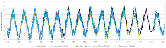 Various measuring stations along the Lahn river in Marburg were used to analyze the temperature curve (see Figure 10). These measuring stations showed similar seasonal patterns, with water temperatures generally rising from spring to August and falling from August to February. The measuring stations showed a close correlation of R = 0.94. They showed smaller temperature increases than indicated by Caissie [18] (see Table 3).