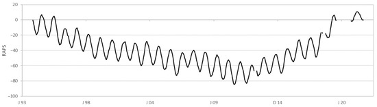 The temperatures measured at the Wehrda waterworks were plausible according to Figure 10 and were highly representative due to a high measurement interval and a large amount of data. The temperature differences along the Lahn river were relatively small. Therefore, the water temperatures at the Wehrda waterworks were used as representatives for the entire study area. Using the RAPS method, it can be seen that the temperatures show a trend (see Figure 11). The parabolic shape of the RAPS values indicates a continuous unidirectional temperature trend caused, for example, by urbanization or a gradually changing environment, like one affected by climate change [17]. Here, temperatures rose over time. From spring 2011, the RAPS values rose faster than they previously fell. This indicates a slight shift [17]. There may have been a change in instrumentation here or climate change could no longer only be reflected in a linear rise in temperature.