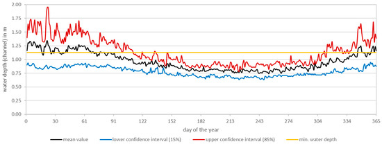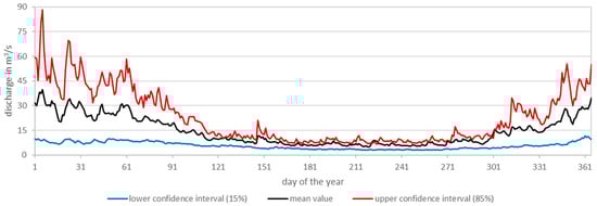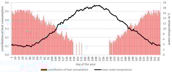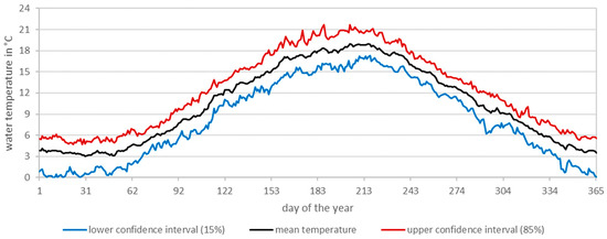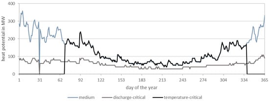 Equation (1) for calculating the heat potential gives rise to challenges in determining the individual physical variables. Various studies use different values for the discharge, e.g., the mean discharge per month or quarter [2], the minimum daily mean over 77 years per month [8], the low water discharge [10], or a sensitivity-specific proportion of the winter discharge as a constant value over the year [7]. In this paper, a hydrograph was used over the typical year, with daily mean values and confidence intervals. The mean low water discharge (per heating period or year) was used for dimensioning. Hereafter, an average scenario with average flow values and a discharge-critical scenario with flow values in the lower confidence interval were considered. The water temperatures were treated equivalently.