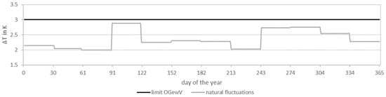 Alternative approaches move away from blanket limit values and instead focus on the natural fluctuations in water temperatures or the warming trends caused by climate change. With global warming, temperatures in water bodies are also rising on average. This trend can be mitigated by the hydrothermal use of the water bodies. If the effects of climate change on water bodies can be quantified, then the permissible cooling of water bodies can be aligned with the temperature increase caused by climate change. A brief overview of the climate trend has already been provided (see Section 3.1.1); the following applies to the KLIWA regions and also to Marburg. Measurement data are currently being collected as part of a KLIWA study, but the scope and evaluation status of these data are not yet sufficient to make reliable statements on long-term effects caused by climate change [25]. It is also possible to limit the cooling to the natural fluctuations of the water [26]. For the natural fluctuations, the standard deviation or the confidence interval between the 15th and 85th percentile can be used as the average deviation from the long-term mean value (e.g., per day of the year).