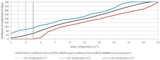 Cooling must be kept within the natural fluctuations. Temperatures between 1 °C and 4 °C can be found in the literature, up to which the water can be used thermally. In this case study, the potential curves for 2 °C and 3 °C critical temperature coincided. While the heating period can practically not be used at a critical temperature of 4 °C, hydrothermal use is almost always possible at a critical temperature of 3 °C (see Figure 28). In the scenarios for cooling to a minimum temperature, the 0 °C curve coincided with the 1 °C curve, as the natural fluctuations usually limit the permissible cooling to up to 2 K during the heating period. In the following, a critical temperature of 3 °C and a minimum temperature of 1 °C are assumed.