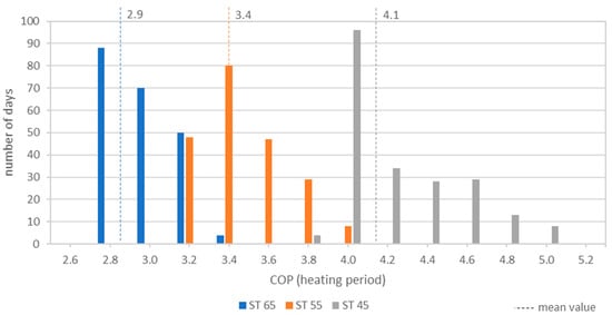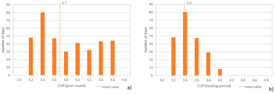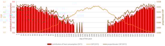 In order to determine the maximum hydrothermal coverage per day, the heat demand must be compared with the heat output of the heat pump in the medium scenario. The heat demand is based on the previous heat consumption but can also take consumption forecasts into account where feasible. For the heat output of the heat pump, the heat potential of the Lahn river is combined with the day-specific COP. The shares can then be averaged per month or per heating period and complementary period. For a realistic estimate of the hydrothermal coverage, the usable discharge share of the MNQ must be estimated. As the COP is low, particularly in the heating period, due to the low water temperatures (see Section 3.1.7), the cost-effectiveness and efficiency of the system can be improved by not operating it monovalently but by using the hydrothermal energy to cover the base load. The base load covers up to 80% of the total annual work and amounts to between 10% and 40% of the maximum output [49]. Base load modules can be defined above a relative plateau within this range, or the standard approaches of public utilities can be used. There are also research approaches for developing an economically and ecologically optimized design method [50]. In this context, hydrothermal coverage is the proportion of days heated with hydrothermal energy out of the total heating days per year.