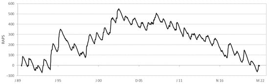 Where trends and irregularities of time series are not visible in their representation over time, particular time series analysis methods help. The Rescaled Adjusted Partial Sums (RAPS) method is appropriate for time series analysis in hydrology, like for river flow and water temperatures [16]. This method eliminates the concealing effect of the mean and variability of the data by rescaling the variable and summing the resulting departures about the mean over time [17]. Due to the summation of consistent small departures spanning several time increments, large cumulative departures can be recognized. The following equation defines the RAPS values: