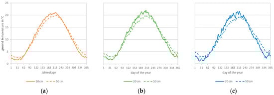 The following applies to the average values from the three measuring stations (see Figure 26) at a depth of 20 cm: Between November and March, the ground temperatures are lower than the water temperatures. During the majority of the heating period, heat is therefore dissipated via the transport pipes. Shorter pipe runs are therefore recommended. In the mild to warm months, the ground serves as an additional heat source. For the ground at a depth of 50 cm, an attenuation and shift in temperature differences can be observed. In the first half of the year, heat can be expected to escape from the pipes, and in the second half of the year, heat can be expected to enter the pipes. With the use of heat storage technologies, the ground can represent an additional heat source in the annual total so that longer pipe runs can be advantageous in terms of heat energy. The sum of the temperature differences is positive in the typical year (150 K∙d in 20 cm, 140 K∙d in 50 cm).