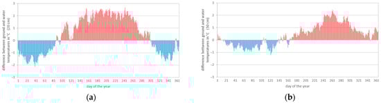Differences between the mean ground temperatures and water temperatures in a typical year for depths of (a) 20 cm and (b) 50 cm; the bars indicate the thermal discharge (red) into the pipes and heat output (blue).