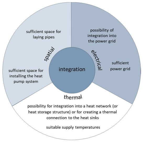 In addition to the characteristics of the water body, hydrothermal-positive characteristics of the surroundings are also relevant. In terms of infrastructure, spatial, electrical, and thermal integrations play a role (see Figure 27). Spatial integration: To transport the heat from the river to the heat pump and from the heat pump to the heat sinks, sufficient space must be available for the pipes. If existing pipelines can be used or construction work is planned, then costs for the pipes can be reduced. A new waterworks is to be built at the Wehrda waterworks in Marburg. Here, the simultaneous installation of a pipe infrastructure for a future hydrothermal system is a suitable option. Furthermore, sufficient space must be available for the heat pump system. This can be particularly difficult in city centers [47]. In Wehrda, for example, the pump house of the old waterworks can be used to install an intermediate heat exchanger. Electrical integration: To operate a heat pump, it must be connected to a sufficiently strong power grid. Up to seven times more electricity may be required to start a heat pump than for normal operation [47]. Thermal integration: The integration of the river heat into the heat sinks, e.g., through a heat network, is necessary, and suitable supply temperatures are also important (see Section 3.1.7).