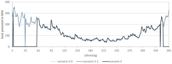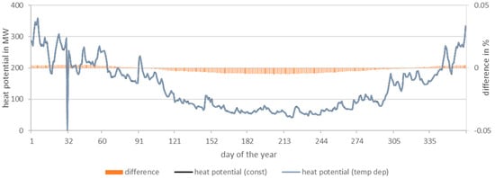 The temperature dependence of the specific heat capacity and density of water had only a slight effect on the heat potential (see Figure 31). The deviation between the two curves was up to 0.5% of the constant potential. The potential varied by up to 700 kW, which could supply several households with heat but was insignificant in view of the overall potential.
