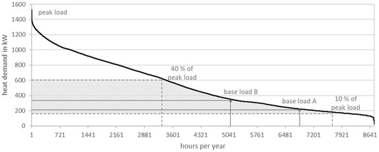 In the annual duration curve of the Stadtwerke Marburg (see Figure 32), the base load modules A and B were each assumed to be above a relative plateau in the base load range. The base load A was 210 kW (14% of the peak load, exceeded on 7100 h), means 20% hydrothermal coverage and could be covered with a COP = 2 via 2 DN125 suction pipes (4.5 K spread, of which 1 K heat loss). The base load B was 325 kW (21% of the peak load, exceeded on 5359 h), means 40% hydrothermal coverage and could be covered with a COP = 2 via 3 DN125 suction pipes (4.5 K spread, of which 1 K heat loss).
