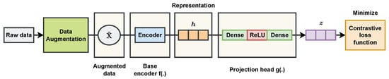 Figure 1 shows the pretrained task for the SCL model, in which the input data are augmented to create two new versions with different views using data augmentation techniques, which will be explained in Section 3. After data augmentation, the encoder takes the different data views and represents them into embedding space with high-level features. In the pretrained task, the weights of the encoder are preserved and frozen to serve for the downstream task. The projection head uses a series of nonlinear layers to apply nonlinear transformations and project the obtained encoder. The pretrained task aims to minimize the value of the contrastive loss function, which evaluates the similarity between any two inputs.