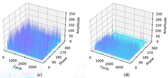 Figure 3 presents data for the PRPDs under the four types of faults with 3600 power cycles using a UHF sensor (). As shown in Figure 3b, the floating discharge pulses are widely distributed throughout the graph with a very high intensity, reaching approximately the threshold of 250. A similar trend occurs in the particle; however, the intensity is unstable and lower (the average is approximately 150) compared to the floating. From the aforementioned, both types of discharge pulses (including corona and void) have an almost similar type of distribution when concentrating more on the under half. As regards corona and void, the pulses are distributed from 0 to approximately 200 and 0 to approximately 240, respectively.