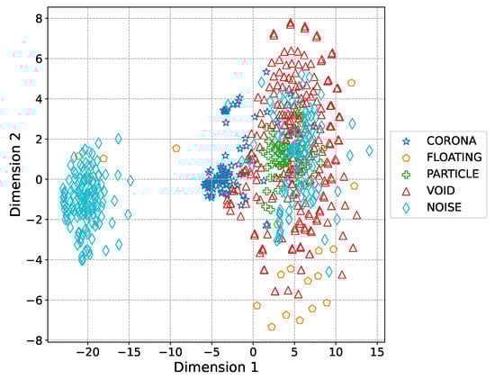 Figure 5 shows the t-distributed stochastic neighbor embedding (t-SNE) for the input vectors of five PD defect types, where t-SNE creates a lower-dimensional map that presents the intrinsic structures in a high-dimensional dataset through a nonlinear dimension reduction technique []. Although the t-SNE converts vectors with high-dimension into 2D space, it still keeps the local similarities and provides a visual indication of the data arrangement from initial vectors []. As shown in Figure 5, the distributions of the raw UHF signals are mixed with the high density, thereby making it impossible to distinguish discharge defects only by seeing the input t-SNE graph without performing any transformation.