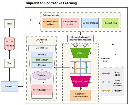- The supervised contrastive loss is expressed as []withwhere is the set that eliminates element i from I and is the set of indices of the positive samples whose label is the same as the i-th label. Here, > 0 denotes the scalar temperature parameter and denotes the total number of elements of the set.